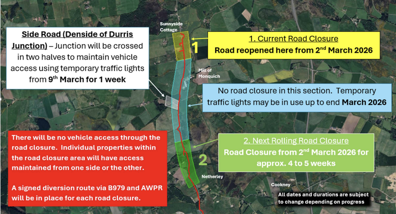 Diversion routes are clearly signed and will be in place for both road closures. This route will be via B979 and AWPR.